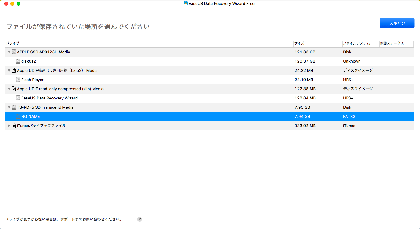 SDカードをMacにつなぐと、今回繋いだデバイスが新たに追加されます。それを選択して右上の「スキャン」を押します。